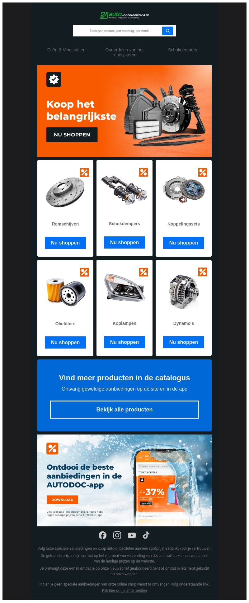 Deze nieuwsbrief biedt geweldige aanbiedingen op auto-onderdelen zoals remschijven, schokdempers, en meer. Winkel nu om te profiteren van scherpe prijzen en verbeter de prestaties van je auto. Mis de deals in de AUTODOC-app niet, waar je tot 37% kunt besparen. Verken onze catalogus voor meer opties.