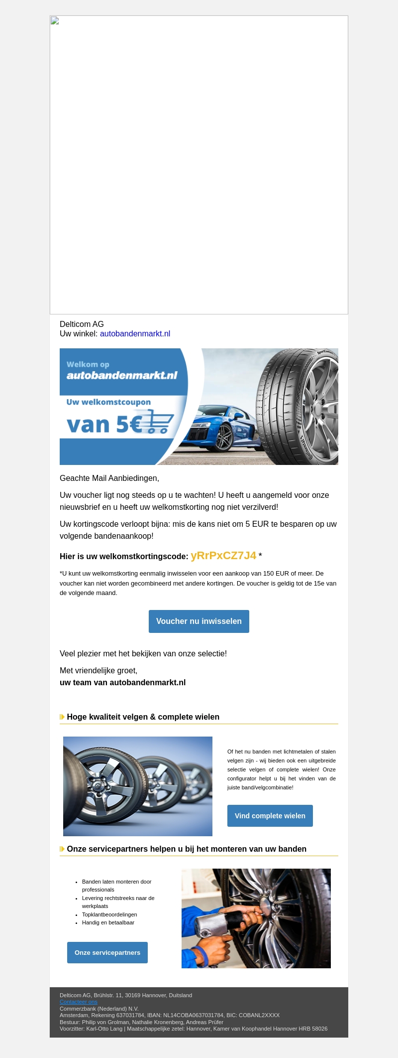 Uw welkomstvoucher van €5 wacht op u bij Autobandenmarkt.nl. Verzilver deze nu bij een minimale aankoop van €150 en geniet van hoge kwaliteit velgen en complete wielen. Bezoek onze winkel en ontdek de beste servicepartners voor het monteren van uw banden. Laat deze kans op geweldige korting niet aan u voorbijgaan. Vergeet niet, uw voucher vervalt binnenkort!
