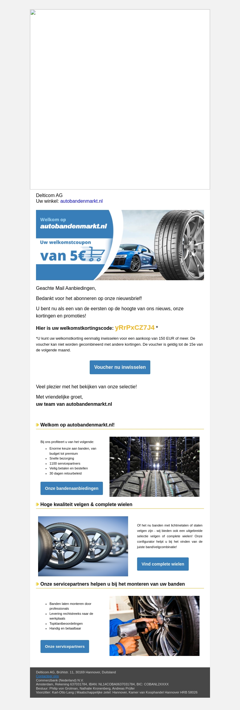 Welkom bij autobandenmarkt.nl! Als nieuwe abonnee ontvangt u een welkomstvoucher van €5. Profiteer van een enorme keuze aan banden, snelle bezorging, en deskundige servicepartners. Uw voucher is inwisselbaar bij een aankoop van €150 of meer. Ontdek ons aanbod en geniet van topkwaliteit wielen.