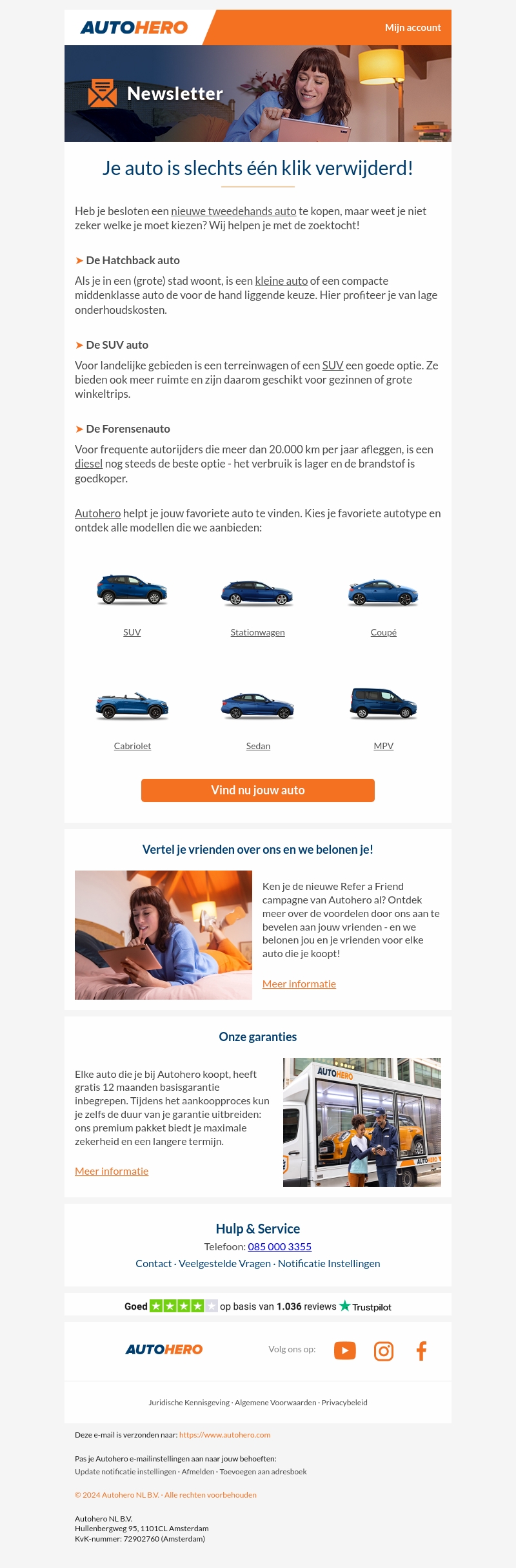 Heb je besloten om een tweedehands auto te kopen? Autohero helpt je bij het vinden van de perfecte auto. Of je nu op zoek bent naar een hatchback voor de stad of een SUV voor avontuurlijke ritten, wij hebben het allemaal. Profiteer van onze speciale aanbiedingen en rijd binnenkort in je nieuwe droomauto.