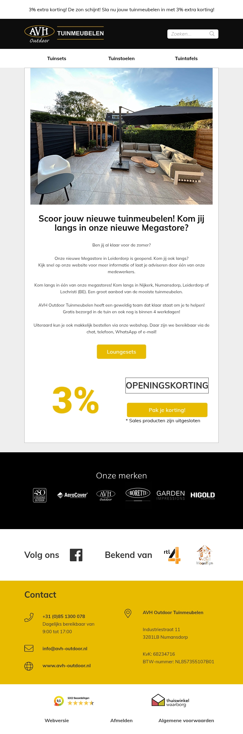 Bezoek onze nieuwe Megastore in Leiderdorp en ontdek de mooiste tuinmeubelen met een 3% openingskorting. Kom langs bij een van onze vestigingen in Nederland en België. Plaats eenvoudig je bestelling via onze webshop en profiteer van snelle, gratis levering. Onze deskundige medewerkers staan klaar om je te helpen.