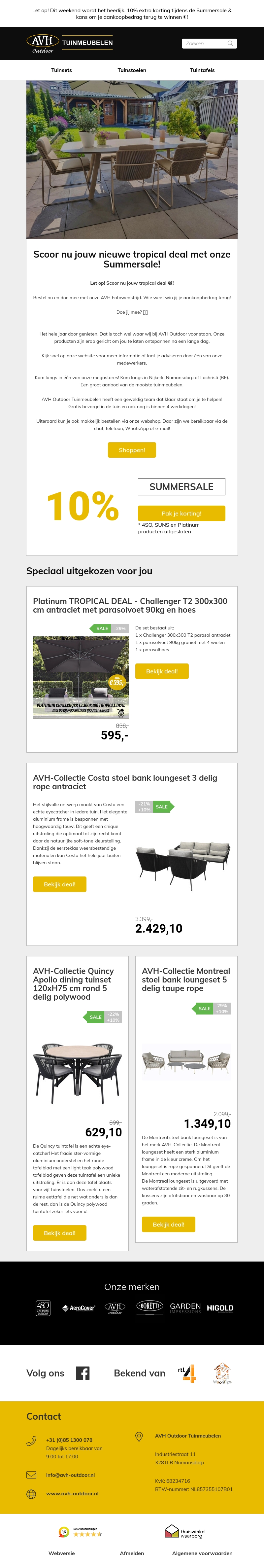 Bij AVH Outdoor Tuinmeubelen is het tijd voor een zonnige Summersale met geweldige kortingen! Geniet van 10% extra korting op geselecteerde producten en maak je tuin zomerklaar met onze nieuwste collecties. Bekijk onze speciale deals en profiteer van fantastische prijzen op topkwaliteit tuinmeubelen.