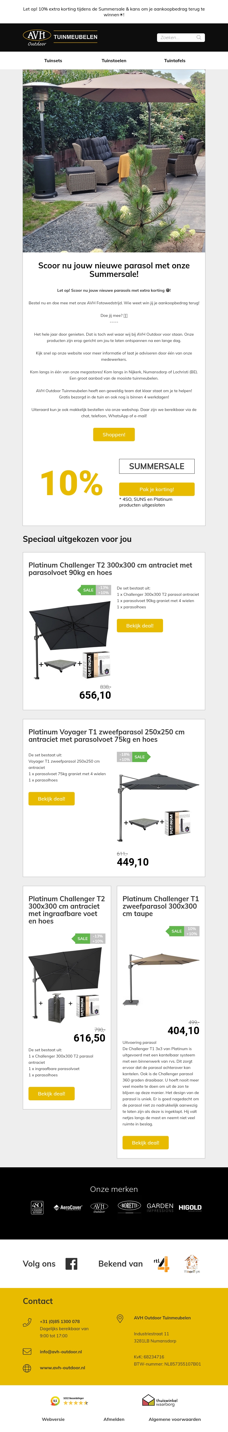 Let op! Scoor je nieuwe parasol met extra korting tijdens onze Summersale van AVH Outdoor. Bestel nu en maak kans om je aankoopbedrag terug te winnen! Kom langs in een van onze megastores of shop online.