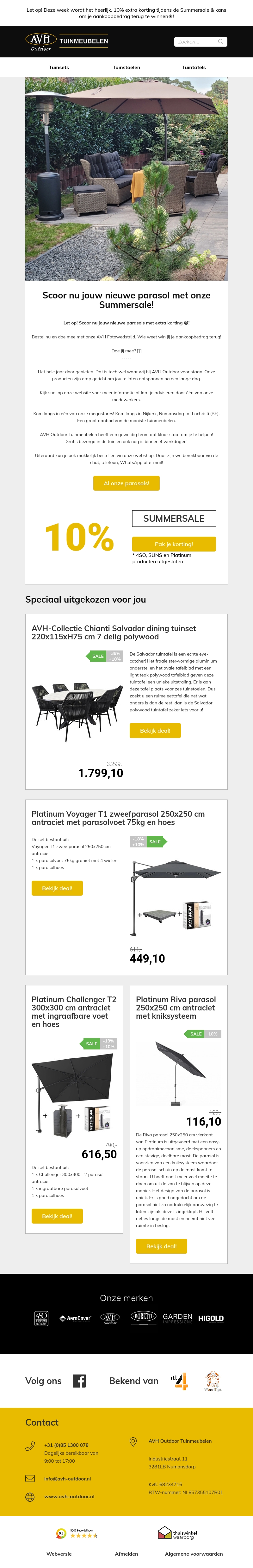 Bereid je voor op zonnige dagen met de nieuwste parasols en tuinmeubelen van AVH Outdoor. Profiteer van 10% korting tijdens de Summersale en maak kans op een aankoopbedrag ter waarde van β¬100! Bekijk de speciaal voor jou geselecteerde aanbiedingen en geniet van kwaliteit en luxe in je tuin.