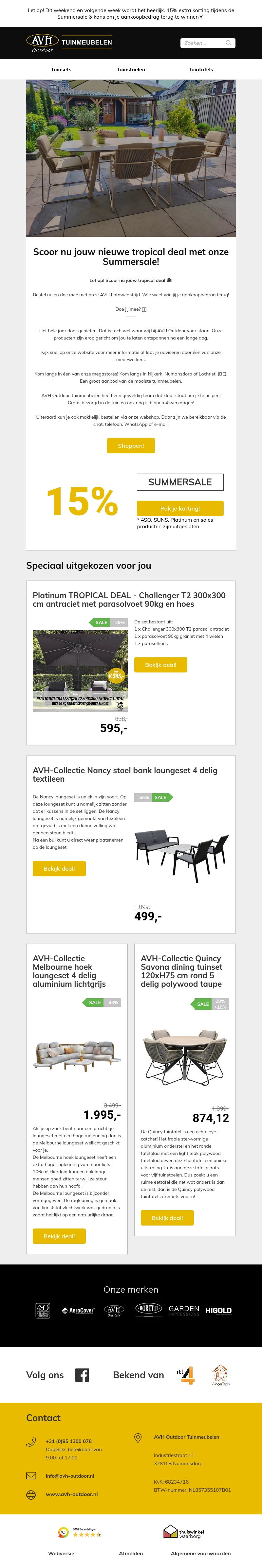 Ontdek geweldige tuinmeubeldeals bij AVH Outdoor Tuinmeubelen's Summersale met 15% extra korting. Haal het beste uit je tuin met onze hoogwaardige meubelen. Mis deze kans niet om je tuin te upgraden met prachtige en comfortabele sets. Bekijk onze specials en profiteer nu van onze aanbiedingen!