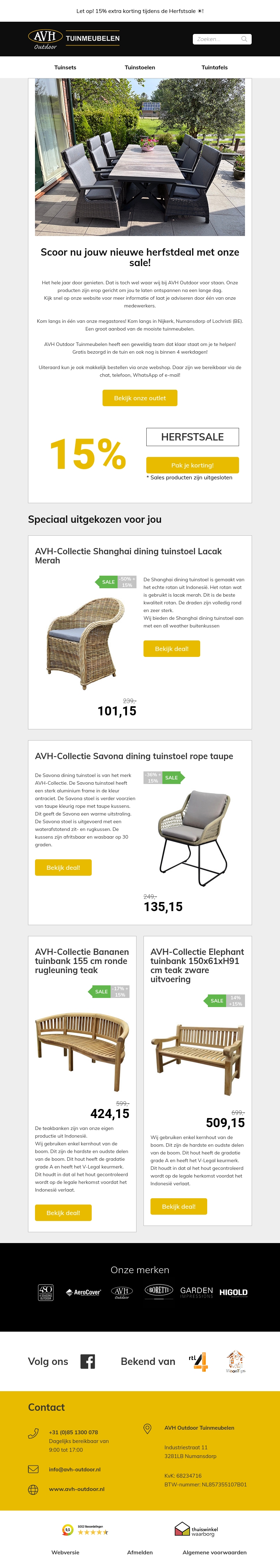 Profiteer nu van 15% extra korting op geselecteerde tuinmeubelen tijdens de herfstsale bij AVH Outdoor. Ontdek onze nieuwe collectie en geniet van de beste deals. Wees er snel bij want op=op! Bekijk onze outlet voor nog meer kortingen.