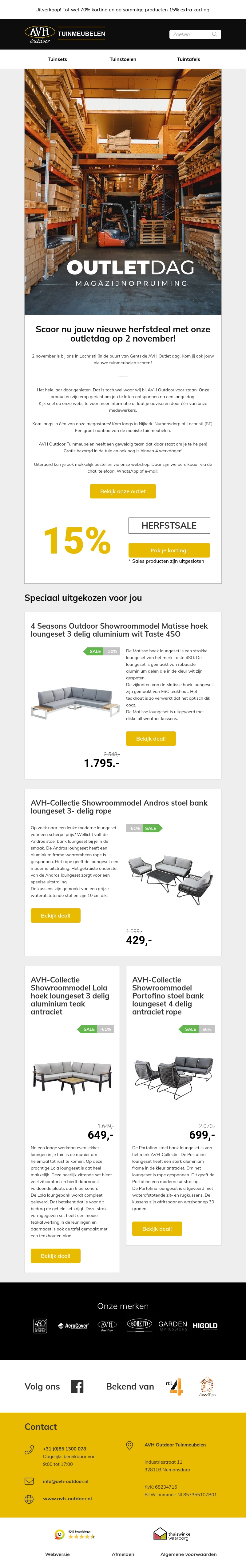 Bezoek onze outletdagen op 2 november en geniet van spectaculaire kortingen tot wel 70% op tuinmeubelen en accessoires. Verken een breed scala aan showroommodellen en unieke stukken, speciaal geselecteerd voor de herfst. Grijp nu je kans om je tuin in stijl te vernieuwen voor de aankomende seizoenen. Mis deze geweldige aanbiedingen niet!