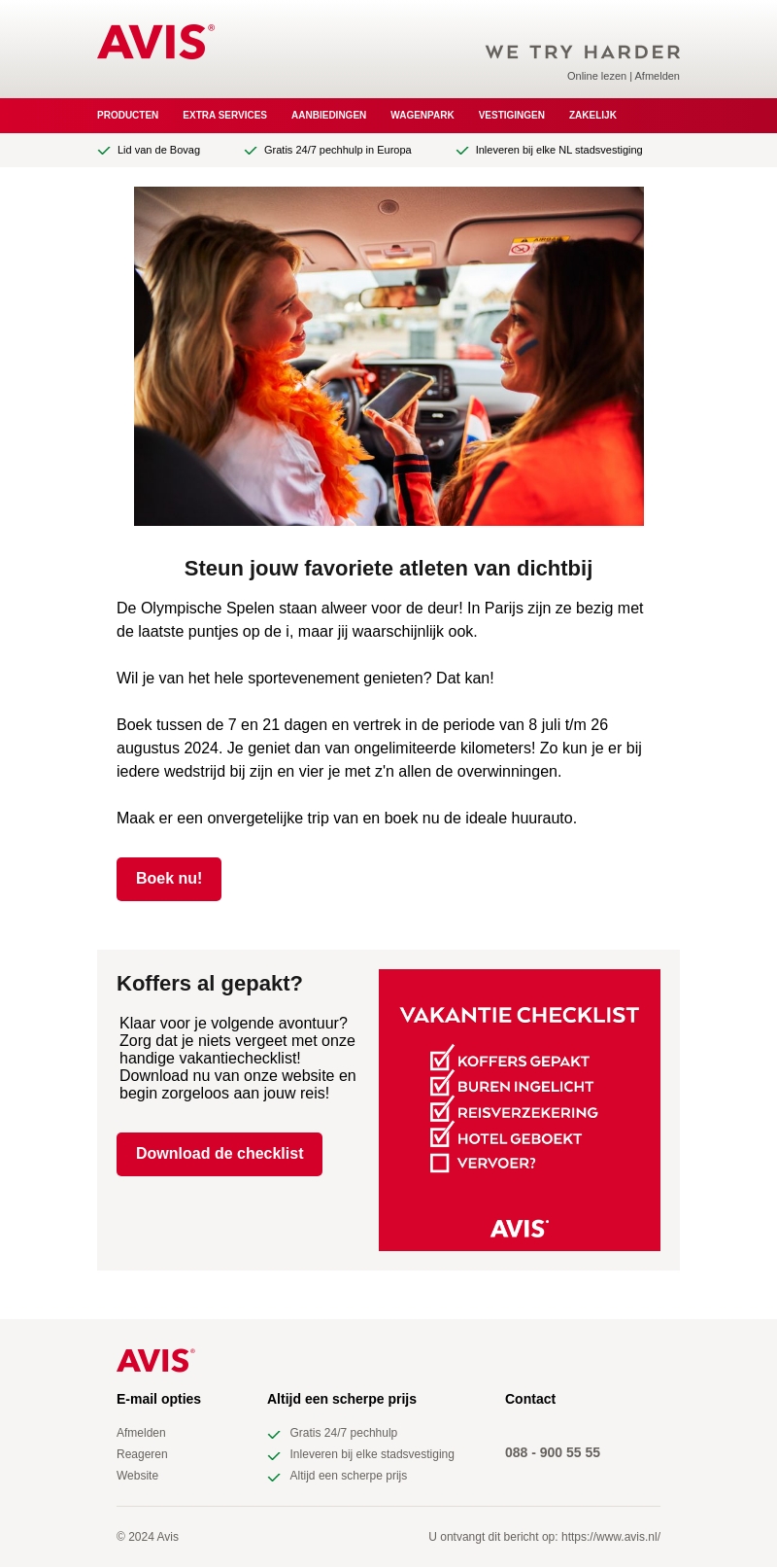 De Olympische Spelen zijn weer in aantocht en AVIS helpt je om deze van dichtbij mee te maken. Boek tussen de 7 en 21 dagen tussen 8 juli en 26 augustus 2024. Geniet van ongelimiteerde kilometers en beleef elke wedstrijd in Parijs op z'n allermooist. Maak je trip onvergetelijk met de ideale huurauto.
