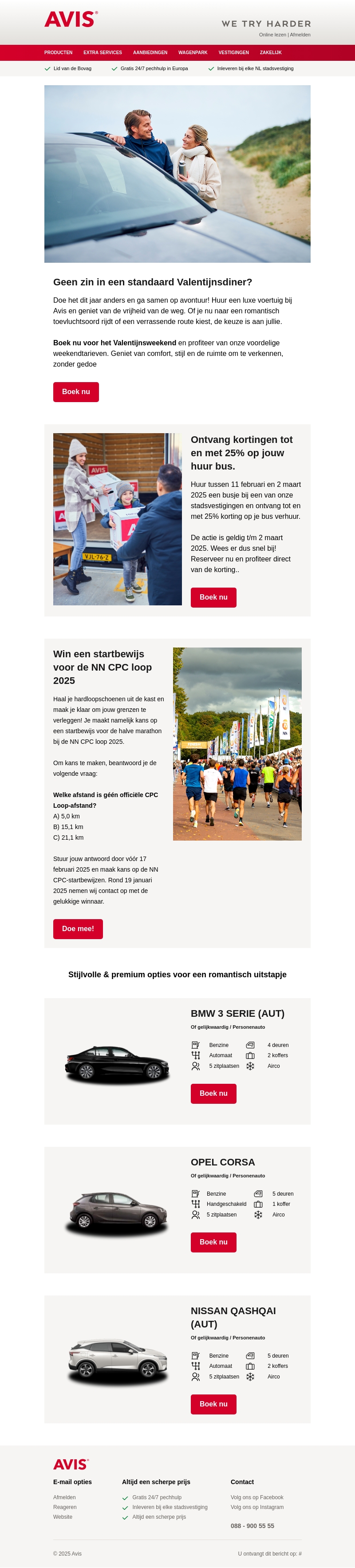 Doe iets anders dit jaar en ga samen op avontuur met Avis. Huur een luxe voertuig en geniet van een romantisch uitje op Valentijnsdag. Ontvang kortingen tot 25% op je huur en maak kans op prijzen. Kies uit stijlvolle en premium auto's voor een perfecte ervaring.