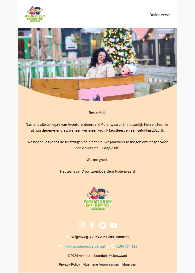 Avonturenboerderij Molenwaard wenst iedereen een vrolijk kerstfeest en een gelukkig 2025. Kom langs tijdens de feestdagen voor een onvergetelijk dagje uit. Geniet van de sfeer en activiteiten met je dierenvriendjes. We hopen je snel te zien!
