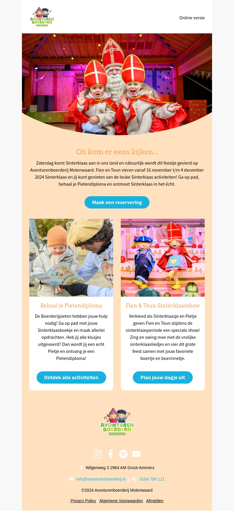 Sinterklaas is weer in het land en daarmee ook gezellige festiviteiten. Bij Avonturenboerderij Molenwaard kunnen kinderen genieten van leuke activiteiten. Haal je Pietendiploma en ontmoet Sinterklaas! De viering loopt van 16 november tot en met 4 december. Maak een reservering en beleef een onvergetelijke tijd met de kleintjes.