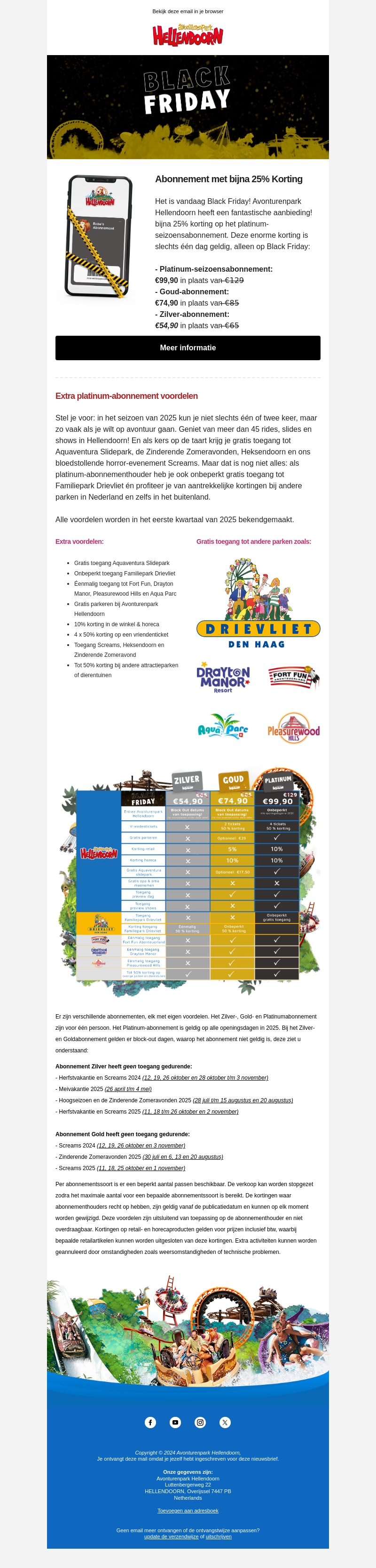 Mis deze Black Friday kans niet bij Avonturenpark Hellendoorn! Ontvang bijna 25% korting op hun Platinum-abonnement, met tal van voordelen zoals gratis toegang tot de Aquaventura Slidepark en meer. Geniet van ongekende avonturen tijdens het seizoen van 2025 voor een scherpe prijs. Verder profiteren van aantrekkelijke kortingen bij andere pretparken.