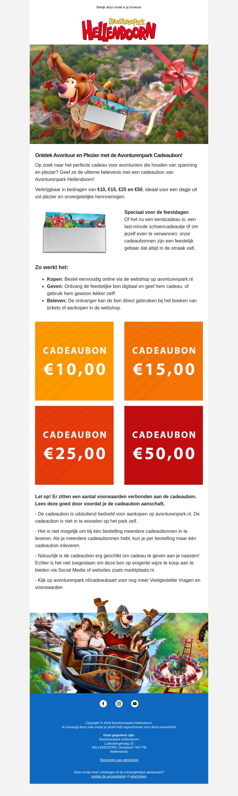 Op zoek naar het perfecte cadeau voor avonturiers? Avonturenpark Hellendoorn biedt cadeaubonnen aan, ideaal voor de feestdagen. Verkrijgbaar in bedragen van €10, €15, €25 en €50. Bestel eenvoudig online en geniet direct van een spannend avontuur. Perfect als kerstcadeau of een last-minute verrassing!