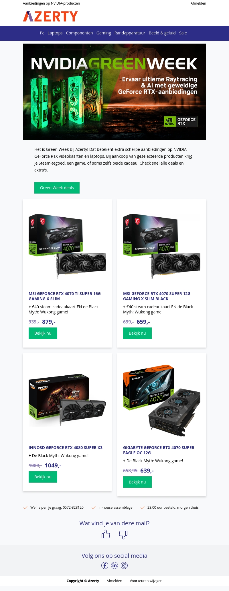 Het is Green Week bij Azerty met exclusieve aanbiedingen op NVIDIA GeForce RTX videokaarten en laptops. Profiteer van extra's bij geselecteerde producten zoals Steam tegoed of een gratis game. Bekijk snel de deals!