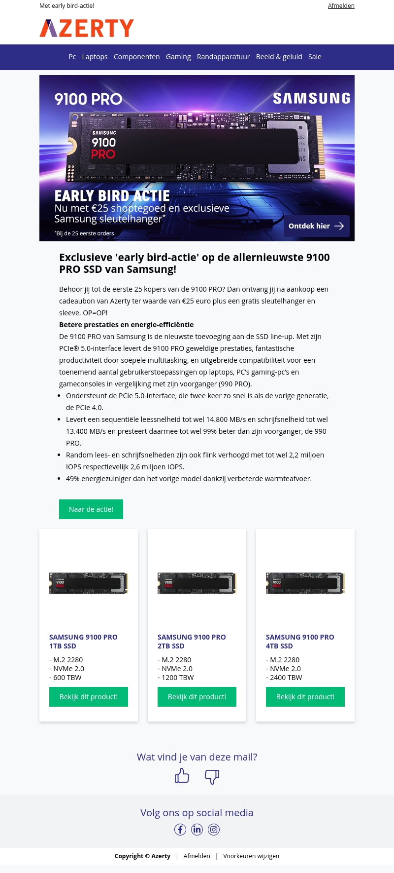 Grijp je kans met de exclusieve early bird-actie op de nieuwste Samsung 9100 PRO SSD! Bij de eerste 25 kopers krijg je €25 shoptegoed en een gratis sleutelhanger. De 9100 PRO levert topprestaties met zijn PCIe® 5.0-interface en is energiezuiniger dan ooit. Verbeter je systeem met superieure lees- en schrijfsnelheden.