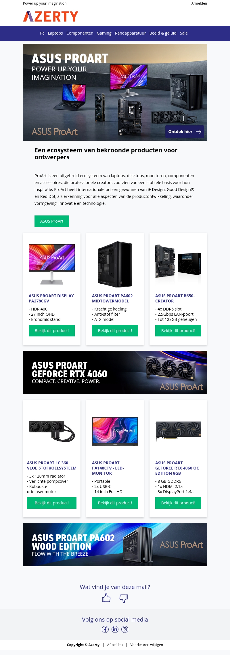 Ontdek de ASUS ProArt serie bij Azerty, speciaal ontworpen voor creatieve professionals. Deze lijn omvat geavanceerde laptops, desktops en accessoires die garant staan voor prestaties en innovatie. Met onderscheidingen van iF Design en Red Dot, belooft de ProArt reeks uitmuntende technologie en vormgeving. Bekijk nu de nieuwste ProArt producten en breng je creativiteit naar een hoger niveau.