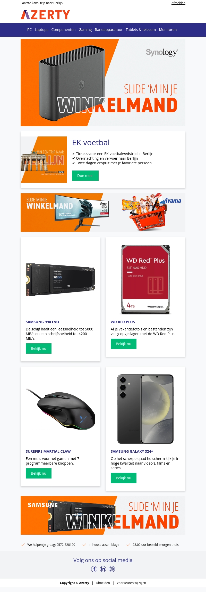 Blader door de nieuwste aanbiedingen van AZERTY en ontdek geweldige deals op tech-producten. Of het nu gaat om opslagoplossingen, gamingaccessoires, of de nieuwste smartphones, er is voor ieder wat wils. Mis de kans niet om een reis naar Berlijn te winnen en beleef een onvergetelijke ervaring!