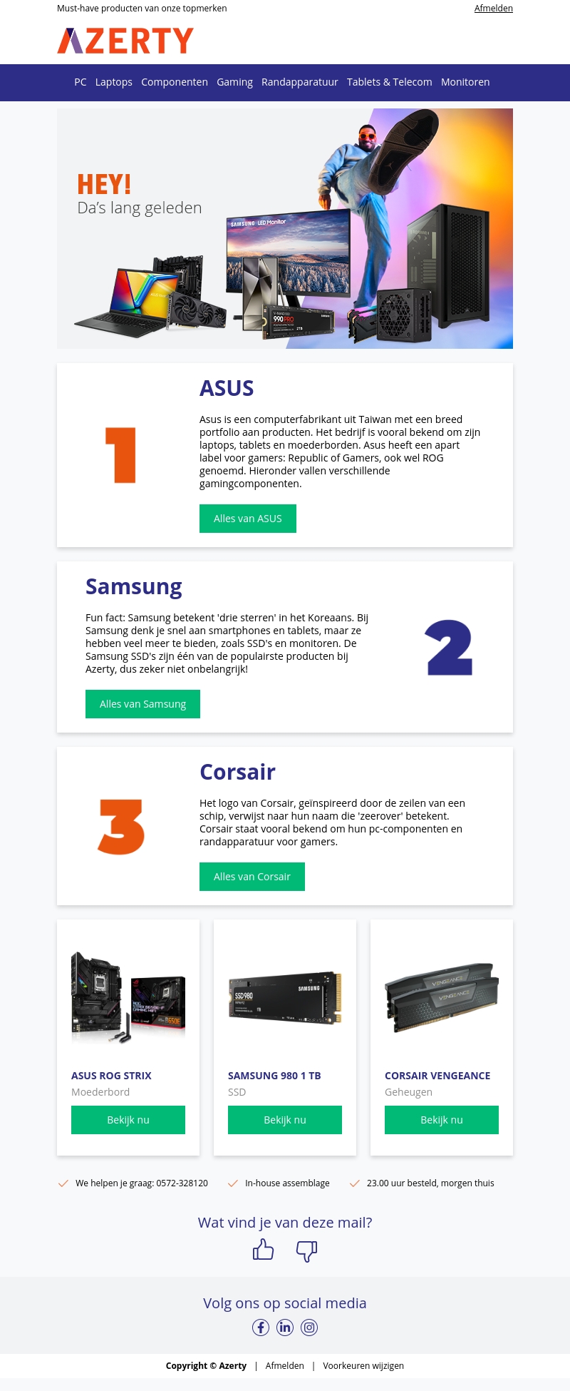 Bij Azerty staan de topmerken ASUS, Samsung en Corsair in de schijnwerpers! Ontdek nu hun uiteenlopende aanbod aan laptops, monitors, componenten en meer. Mis niet de beste deals en nieuwste technologie van deze toonaangevende merken!