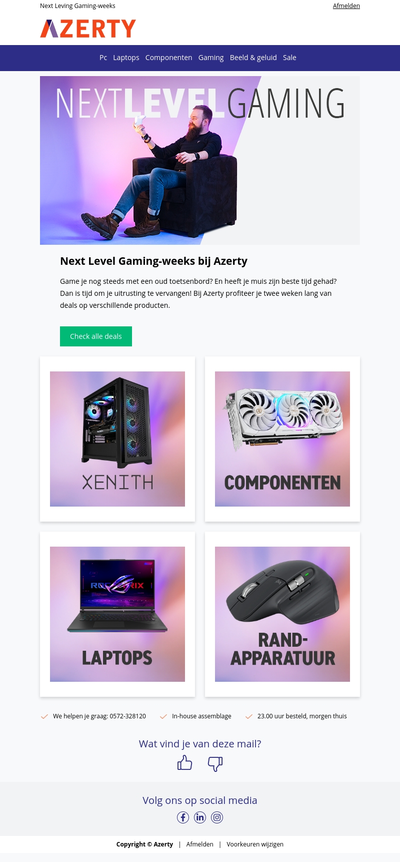 Upgrade je gaming setup tijdens de Next Level Gaming-weeks bij Azerty. Benut tot 20% korting op essentiële producten zoals toetsenborden, muizen, en grafische kaarten. Deze aanbiedingen zijn slechts twee weken beschikbaar. Mis het niet en maak gebruik van deze exclusieve deals. Verbeter je game-ervaring met gespecialiseerde apparatuur. Bezoek Azerty nu voor meer informatie.