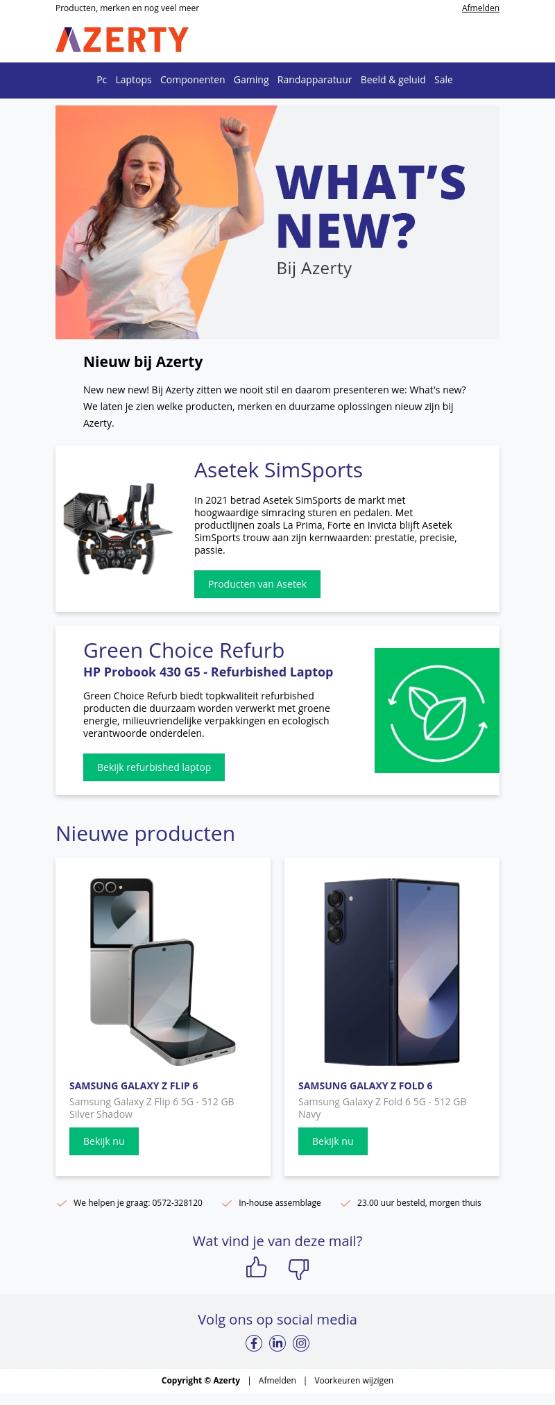 Nieuw bij Azerty: ontdek onze nieuwste producten, merken en duurzaamheidstrends. Van de hoogwaardige simracing apparatuur van Asetek SimSports tot refurbished laptops van Green Choice Refurb en de nieuwste smartphones zoals de Samsung Galaxy Z Flip 6 en Z Fold 6.