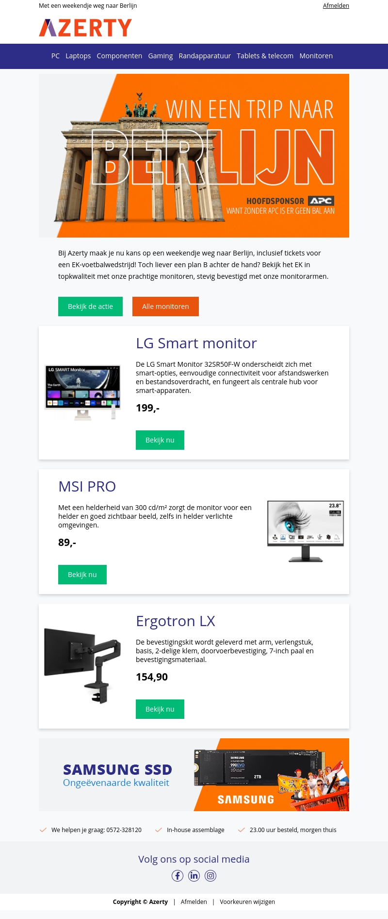 Bij Azerty maak je kans op een weekendje weg naar Berlijn, inclusief tickets voor een EK-voetbalwedstrijd. Verder in deze nieuwsbrief: topkwaliteit monitors zoals de LG Smart monitor, MSI PRO en Ergotron LX en niet te vergeten de ongeëvenaarde Samsung SSD.