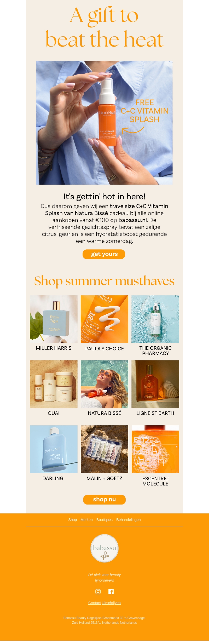 Hou je hoofd koel deze zomer met onze exclusieve aanbieding! Bij een online aankoop vanaf €100 ontvang je een gratis travelsize C+C Vitamin Splash van Natura Bissé. Verfris je gezicht met een heerlijke citrusgeur en hydrateer je huid gedurende warme zomerdagen. Ontdek ook onze zomer musthaves van topmerken zoals Paula’s Choice, OUAI, Darling, en meer. Shop nu en geniet van de zomer!