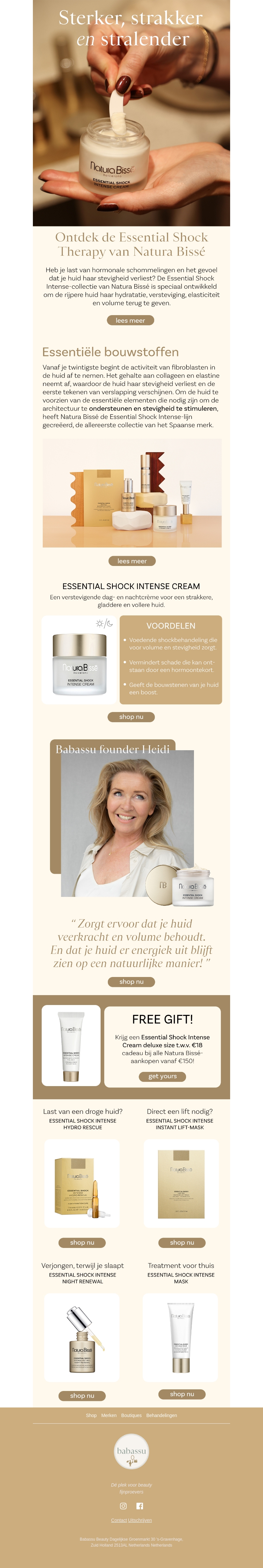 Ervaar de magie van hormoonbalans met Natura Bissé's Essential Shock collectie. Deze behandeling biedt versterking en hydratatie voor een strakkere, gladdere huid. Ontdek hoe Babassu-oprichter Heidi je huid laat stralen met de beste ingrediënten uit Spanje. Inclusief een speciale gift bij aankoop vanaf €150.