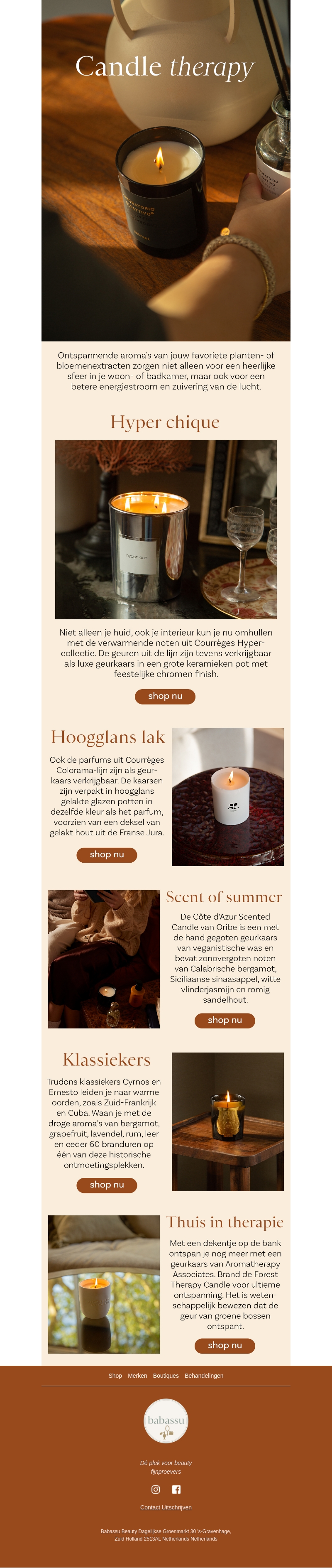 Verwen jezelf met onze exclusieve collectie geurkaarsen. Of je nu kiest voor de warme tonen van Calabrese bergamot of de feestelijke chromen finish van onze Hyper-collectie, je vindt gegarandeerd een kaars die bij je past. Ideaal om je interieur op te fleuren en je zintuigen te verwennen. Ontdek ook de klassieke geuren van Trudon en Ernesto en de bijzondere Thuis in therapie kaars voor ultieme ontspanning. Maak van je huis een oase van rust.