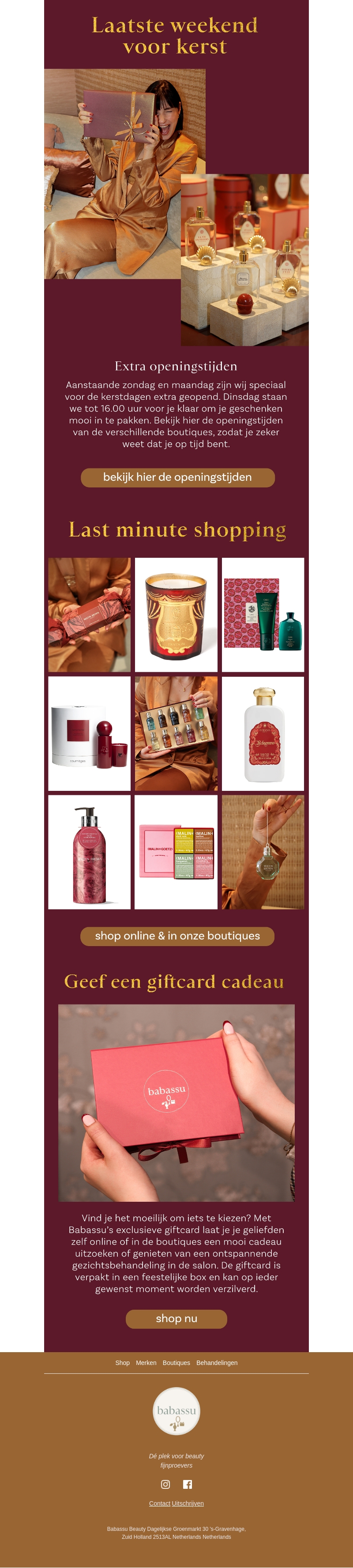 Maak gebruik van onze extra openingstijden voor de feestdagen! Bezoek onze winkels voor unieke kerstcadeaus en pakjes, of geef een giftcard cadeau en bied jouw geliefden de keuze uit een breed assortiment aan exclusieve producten en behandelingen.