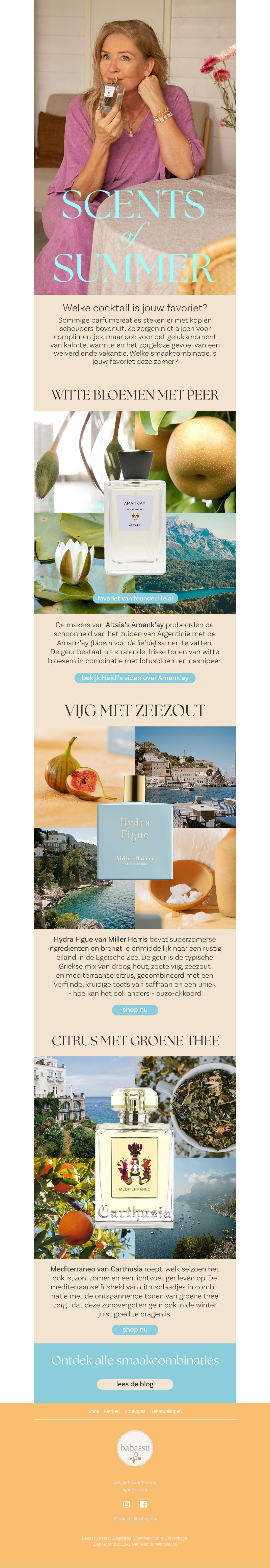 Welke cocktail is jouw favoriet? Ontdek de zomerse parfums van Heidi die je meenemen naar exotische bestemmingen. Van witte bloemen met peer tot vijg met zeezout en citrus met groene thee, er is voor ieder wat wils. Bekijk Heidi's video's en shop jouw nieuwe zomergeur nu.