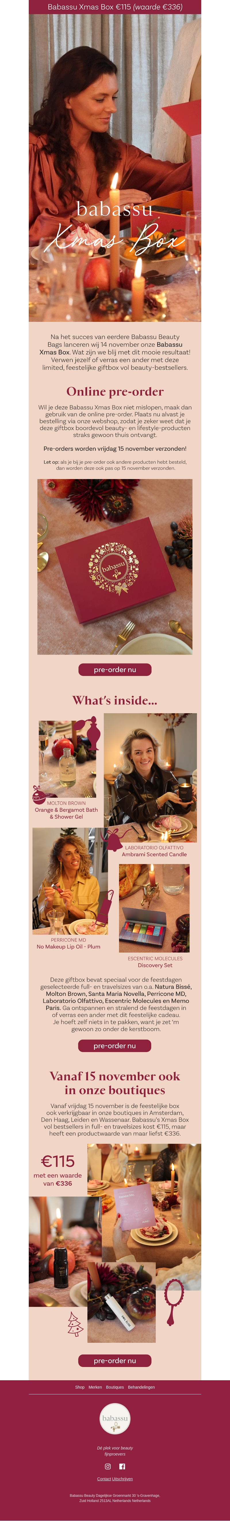 Verwen jezelf of een ander met de Babassu Xmas Box! Voor slechts β¬115 ontvang je een prachtige selectie luxe beautyproducten met een totale waarde van β¬336. De box bevat zorgvuldig geselecteerde items zoals Moulton Brown Shower Gel en Ambra Nera Candle.
