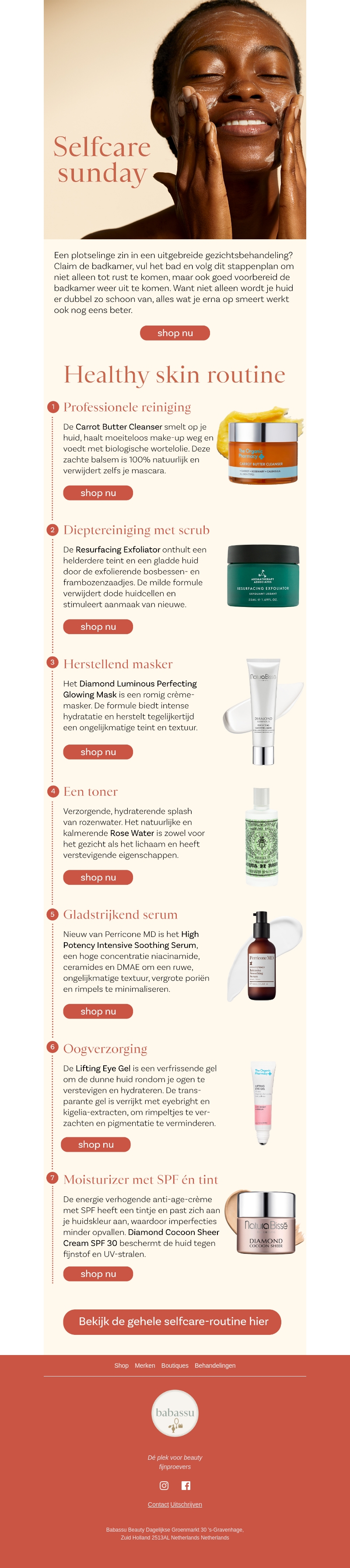 Geef je huid de aandacht die het verdient met onze Selfcare Sunday routine. Begin met een professionele reiniging en eindig met een beschermende moisturizer met SPF. Ontdek onze zorgvuldig uitgekozen producten die je huid voeden, exfoliëren en verjongen. Perfect voor een ontspannende zondag thuis.