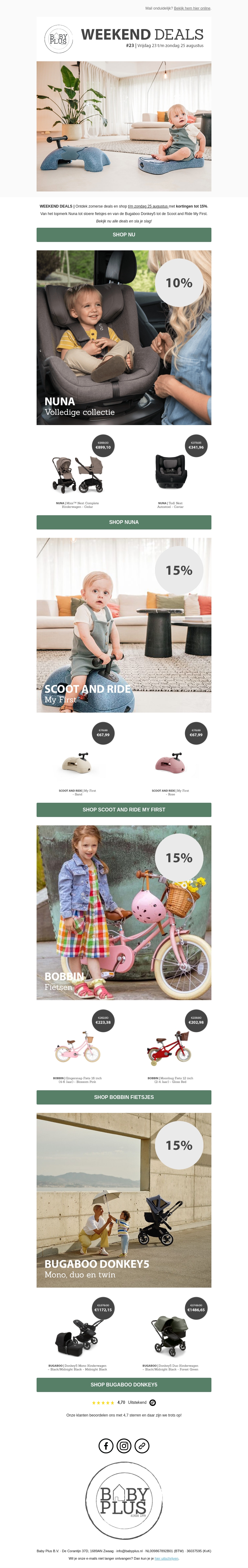 Profiteer dit weekend van geweldige deals op diverse babyartikelen, met kortingen tot wel 15%. Ontdek aanbiedingen op Nuna autostoelen, Scoot and Ride My First loopfietsen, Bobbin Fietsen en Bugaboo Donkey5 kinderwagens. Mis het niet en shop nu om te besparen op hoogwaardige producten.