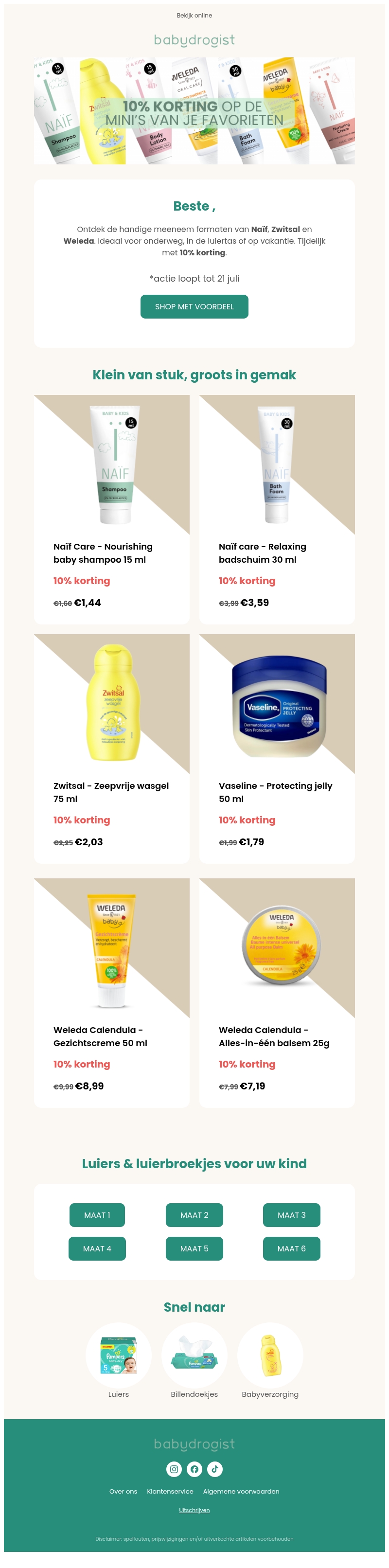 10% korting op mini reisverpakkingen van Naïf, Zwitsal en Weleda