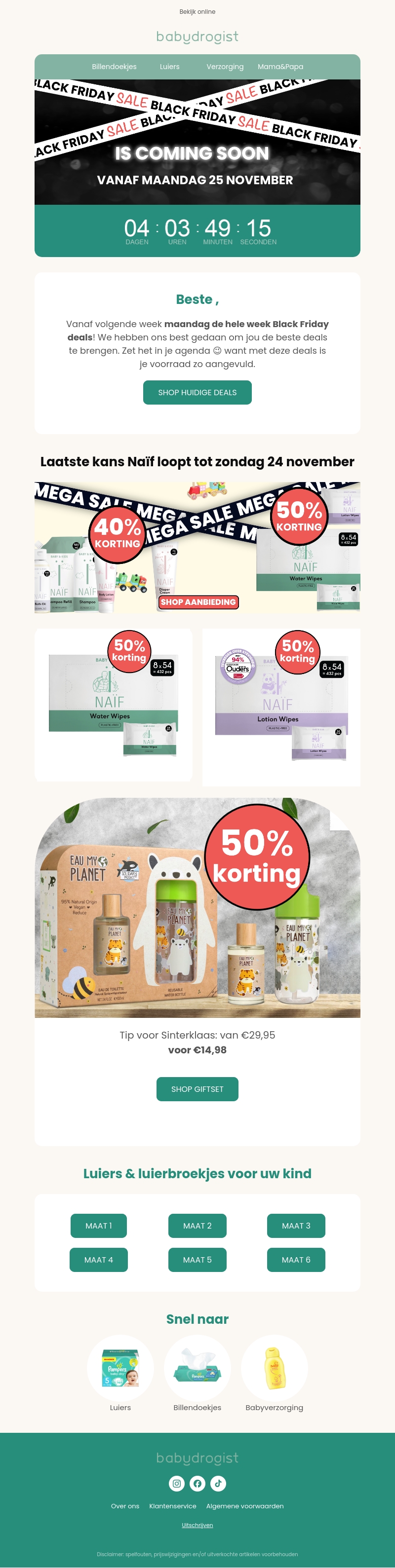 De Black Friday kortingen bij Babydrogist beginnen op maandag 25 november. Geniet van geweldige aanbiedingen, waaronder 50% korting op Naïf producten en een speciale Sinterklaas deal. Zorg ervoor dat je deze kansen niet mist!