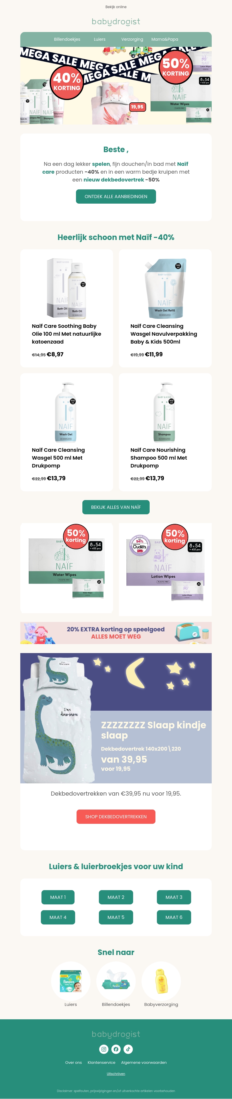 De mega sales bij Babydrogist zijn begonnen! Geniet van kortingen tot 50% op Naif verzorgingsproducten en meer. Ontdek geweldige deals op babyolie, wasgel en dekbedovertrekken. Haast je, want de voorraad is beperkt. Bekijk alle aanbiedingen en shop nu voordelig in bij Babydrogist.