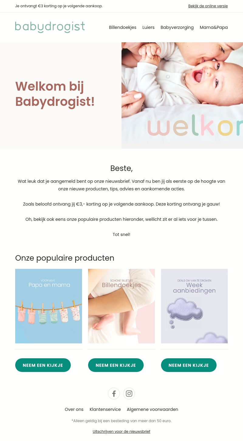Welkom bij Babydrogist! Vanaf nu ben je als eerste op de hoogte van onze nieuwste producten en exclusieve aanbiedingen. Ontvang €3 korting op je volgende aankoop. Bekijk ook onze populaire producten, van billendoekjes tot wekelijkse deals. Mis geen enkele update van Babydrogist.