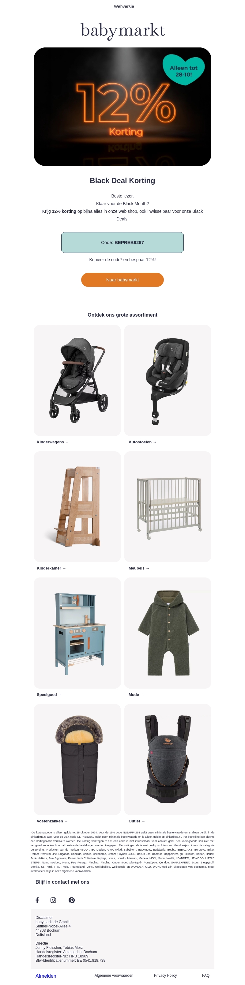 Tijdens de Black Month heeft Babymarkt een speciale aanbieding: 12% korting op bijna het hele assortiment. Deze korting geldt ook voor onze Black Deals en is alleen beschikbaar t/m 28 oktober. Ontdek ons uitgebreide assortiment, inclusief kinderwagens, autostoelen, meubels en meer. Mis deze kans niet om grote kortingen te scoren op allerlei babyproducten. Gebruik de code BEPREB9267 en bespaar direct.