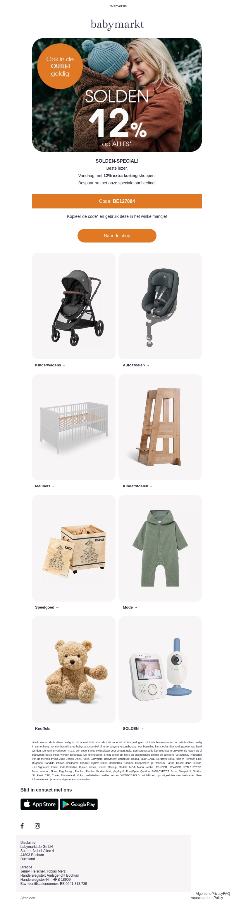 Babymarkt biedt een geweldige korting van 12% op alle producten, zelfs in de outlet. Gebruik de code BE127884 om te profiteren van deze aanbieding. Van kinderwagens tot speelgoed, shop nu alles wat je nodig hebt voor je kleintje. Mis deze kans niet om te besparen op kwaliteitsproducten. Ga vandaag nog naar de webshop en vul je winkelmandje.