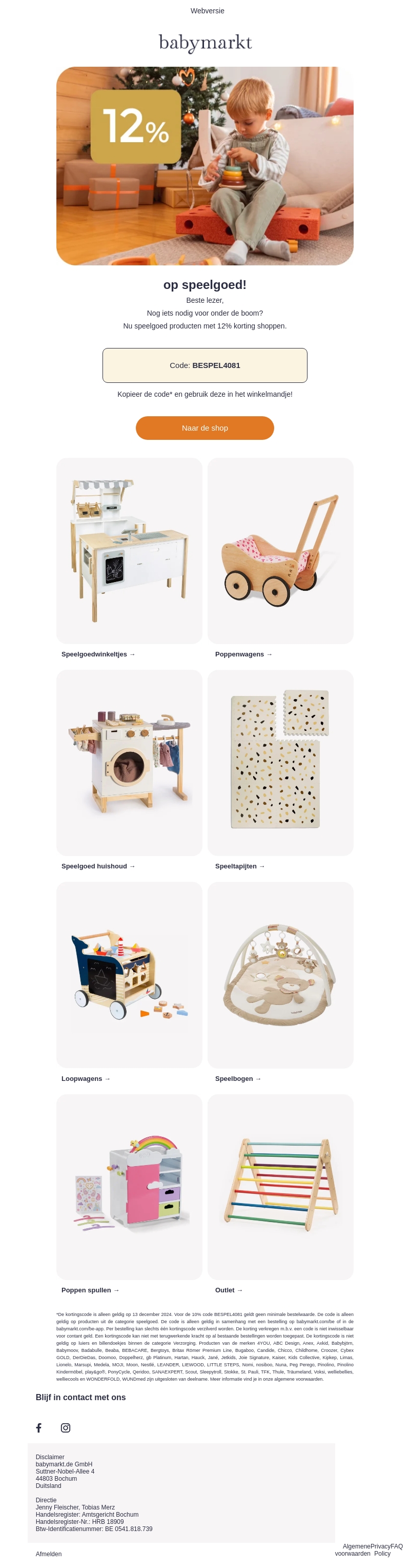 Ontdek het speelgoed dat je kind blij maakt met 12% korting bij Babymarkt. Of je nu op zoek bent naar poppenwagens, speelkleden of loopwagens, het is de perfecte tijd om te shoppen. Vergeet niet de kortingscode BESPEL4081 te gebruiken. Actie geldig tot 19 december 2024.