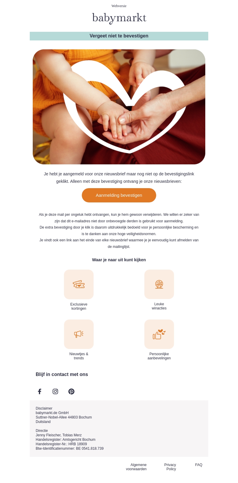 U bent bijna klaar met uw aanmelding voor onze nieuwsbrief. Door uw aanmelding te bevestigen, verzekert u zich van exclusieve kortingen en interessante nieuwtjes. Onze nieuwsbrief houdt u op de hoogte van de laatste trends en persoonlijke aanbevelingen. Vergeet niet op de bevestigingslink te klikken! Als u deze e-mail per ongeluk heeft ontvangen, verwijder hem dan gerust. Veiligheid staat bij ons voorop. Bevestig nu en blijf in contact.