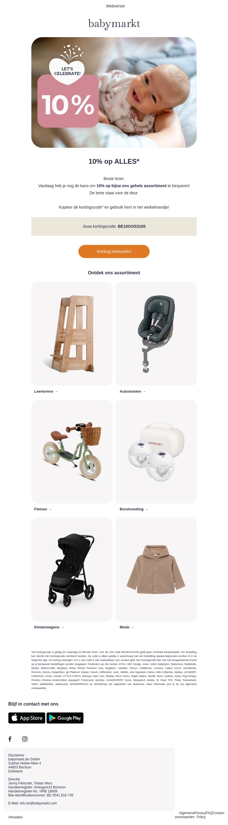 Profiteer van 10% korting op bijna ons gehele assortiment, inclusief leertoestellen, autostoelen en meer. Gebruik de kortingscode vóór het verloopt. Bekijk ons uitgebreide aanbod en mis deze kans niet.