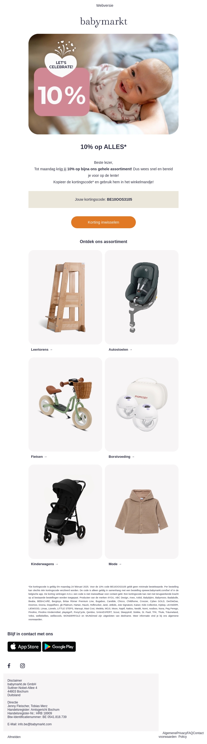 Profiteer van 10% korting op bijna alle producten bij Babymarkt. Met een breed assortiment van leertoestellen, autostoelen en meer, kun je alles vinden wat je nodig hebt voor je kleintje. Gebruik de kortingscode BE10OOS3105 voor deze aanbieding. Wees er snel bij, de actie loopt tot maandag. Bereid je voor op de lente met deze fantastische deals!