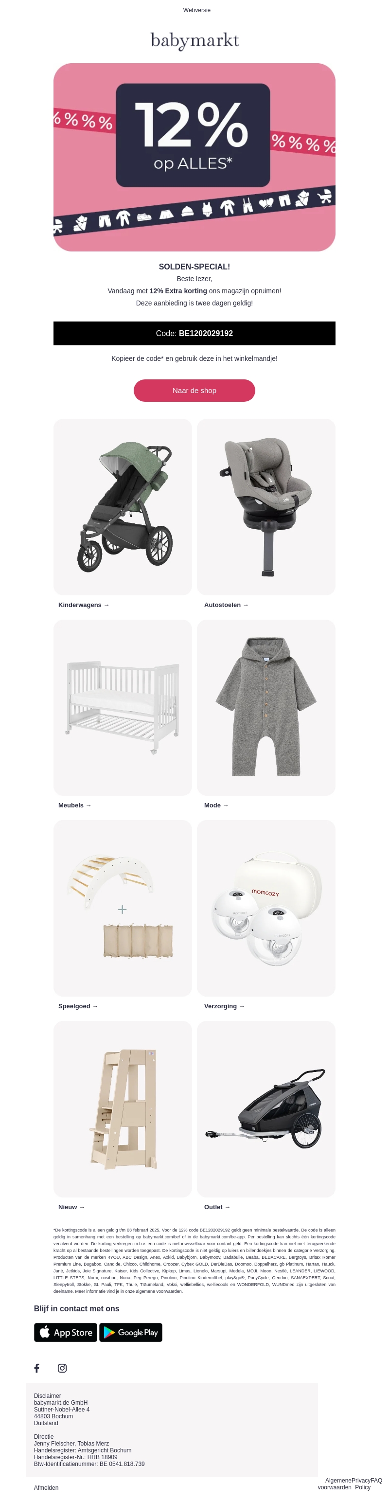 Ontdek ongelofelijke aanbiedingen bij Babymarkt met 12% extra korting op het volledige assortiment. Dit is dé kans om kinderkleding, meubels, en meer voor geweldige prijzen te kopen. Wees snel, want de actie is slechts twee dagen geldig! Gebruik de kortingscode en winkel vandaag nog.