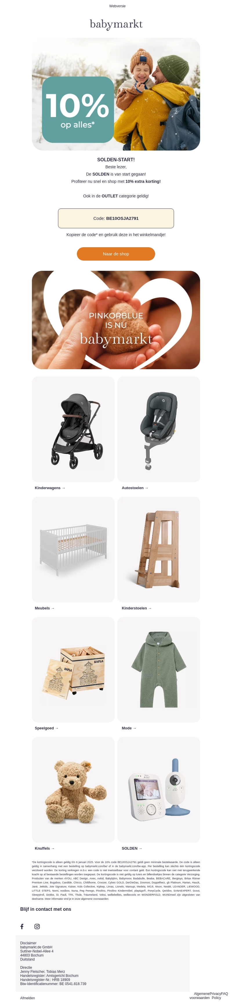 De solden zijn begonnen bij Babymarkt! Ontvang nu 10% extra korting op alles, inclusief items in de outletcategorie. Dit is het moment om je favoriete babyproducten aan te schaffen tegen verlaagde prijzen. Gebruik de kortingscode en geniet van het shoppen!