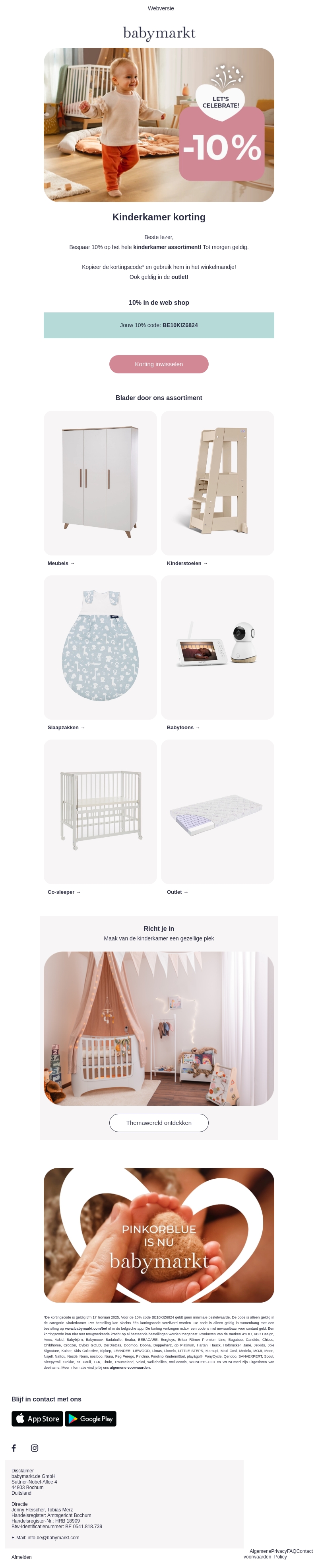 Profiteer van tot wel 10% korting op een breed scala aan kinderkamer producten. Van meubels tot babyfoons en kinderstoelen, er is voor ieder wat wils. Deze aanbieding is echter slechts tijdelijk geldig, dus wacht niet te lang. Ontdek de mogelijkheden in onze webshop of outlet. Vergeet niet uw kortingscode te gebruiken bij uw aankoop.