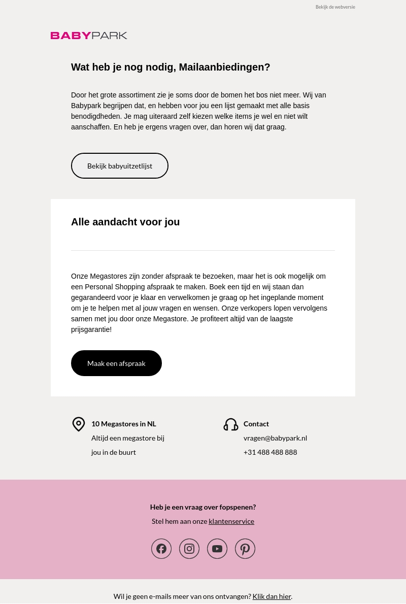 Onze Babypark experts staan klaar om je te helpen met het vinden van de juiste babyproducten. Maak een persoonlijke afspraak voor advies op maat. Bezoek een van onze megastores en profiteer van lage prijsgaranties. Wij hebben alles wat je nodig hebt voor jouw kleintje. Bekijk onze handige uitzetlijst online.