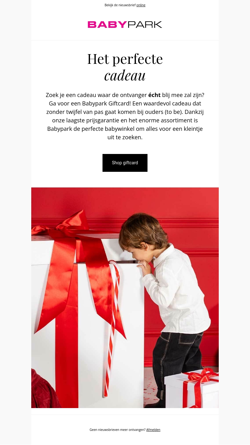 Ben je op zoek naar het perfecte cadeau voor kersverse ouders? Geef een Babypark Giftcard! Deze waardevolle giftcard is ideaal voor ouders en garandeert tevredenheid. Met onze lage prijsgarantie en uitgebreide assortiment is er altijd iets passends te vinden.