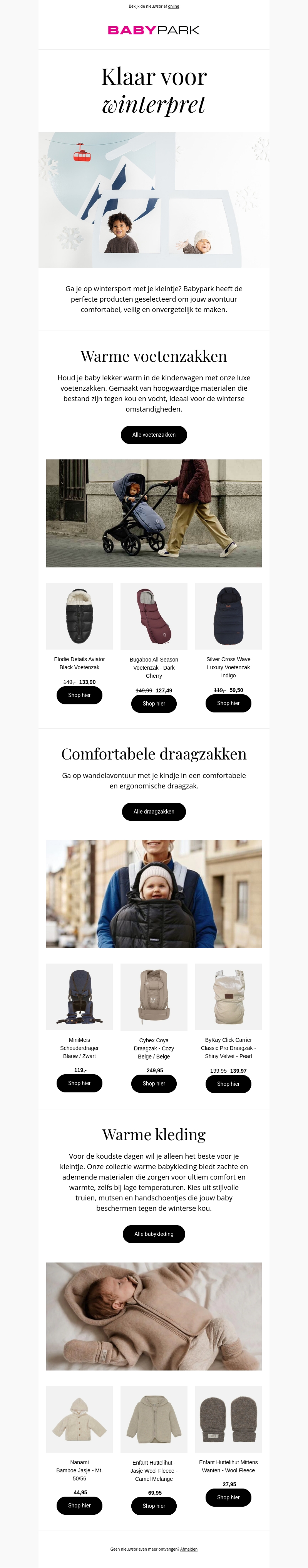 Ga je op wintersport met je kleintje? Ontdek Babypark's selectie winterproducten voor comfort en veiligheid. Van warme voetenzakken tot ergonomische draagzakken en stijlvolle winterkleding, je vindt alles voor een geslaagde winteruitstap.