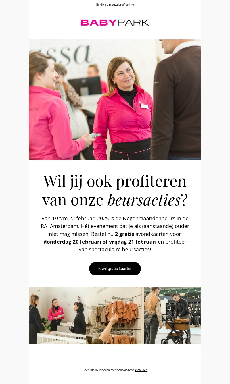 Bezoek de Negenmaandenbeurs in RAI Amsterdam van 19 t/m 22 februari 2025. Ontvang 2 gratis avondkaarten voor een dag naar keuze en profiteer van unieke beursacties. Ideaal voor aanstaande ouders!